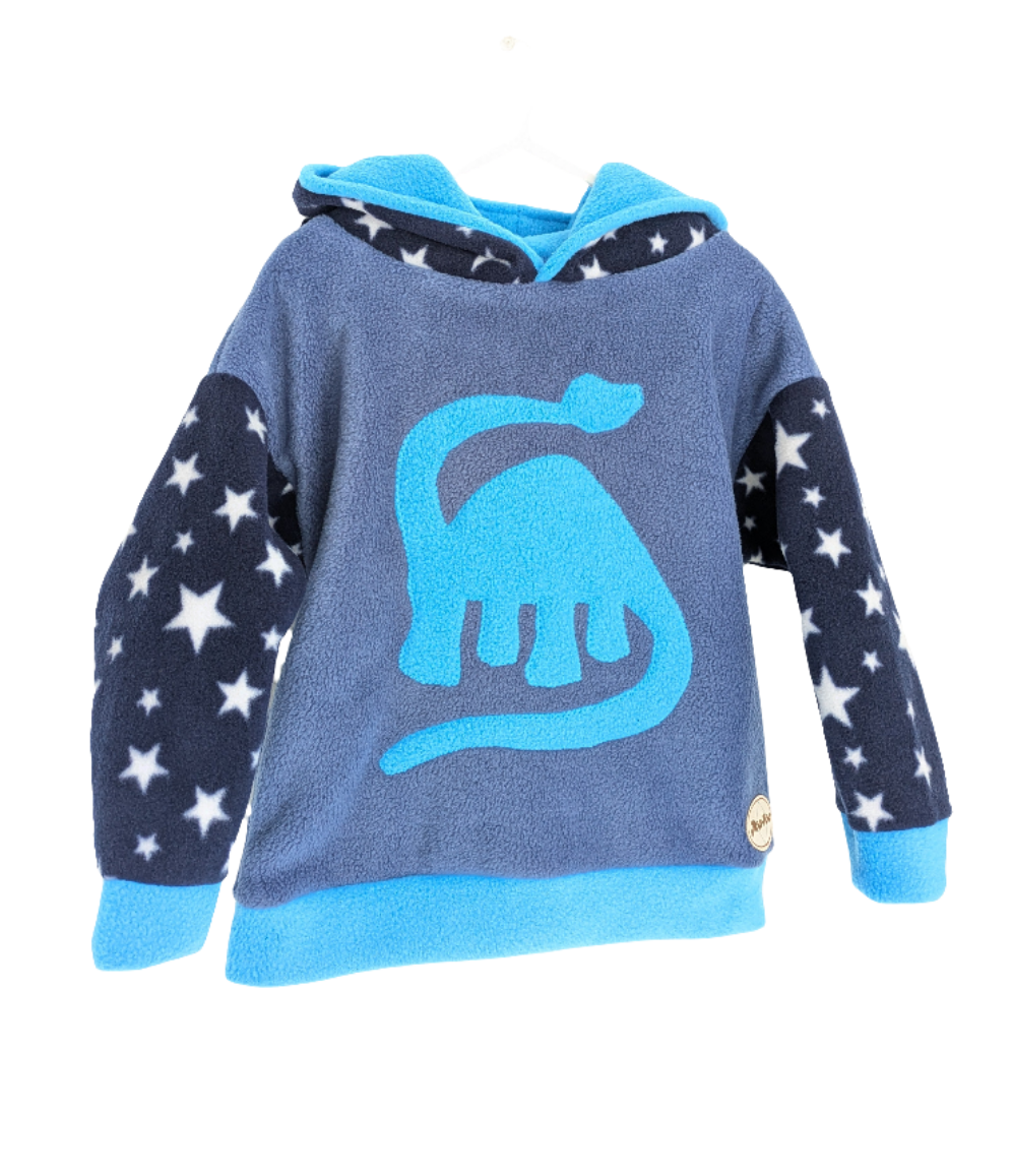 Every child seems to go through a dinosaur phase. They will definitely be able to identify this friendly giant and will be happy to pull on the cosy fleece at every opportunity. The denim blue fleece body has a bright blue dinosaur. The starry fleece sleeves and hood, turquoise hood lining, waistband and cuff all combine to make this a stand out hoodie.